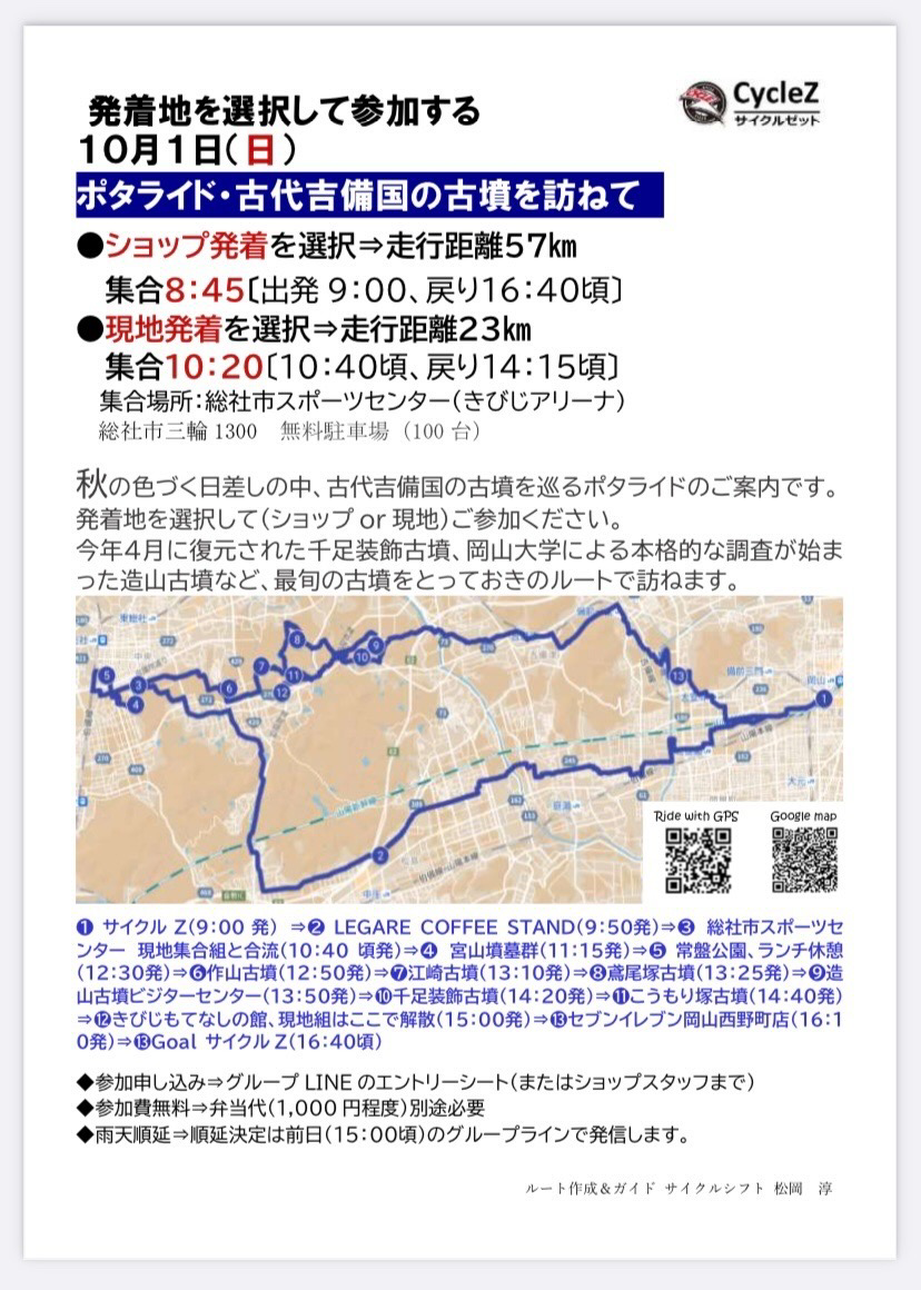 cycleZ2023年09月20日■9月のイベントのご案内\古墳巡りライドを開催します/秋の日差しを感じながらサイクリングするもよし!ゆったり古墳巡りだけを楽しんでもよし!サイクリングに最適な季節をみんなで楽しみましょう♪■日時:10/1(日) **■集合場所 cycleZ前(8:45)または 総社市スポーツセンター(10:20)**参加のお申し込みは**こちら**よりご登録をお願いします。みなさまのご参加おまちしております♪タグ#event#newsこの記事をシェアするポストLINEで送る