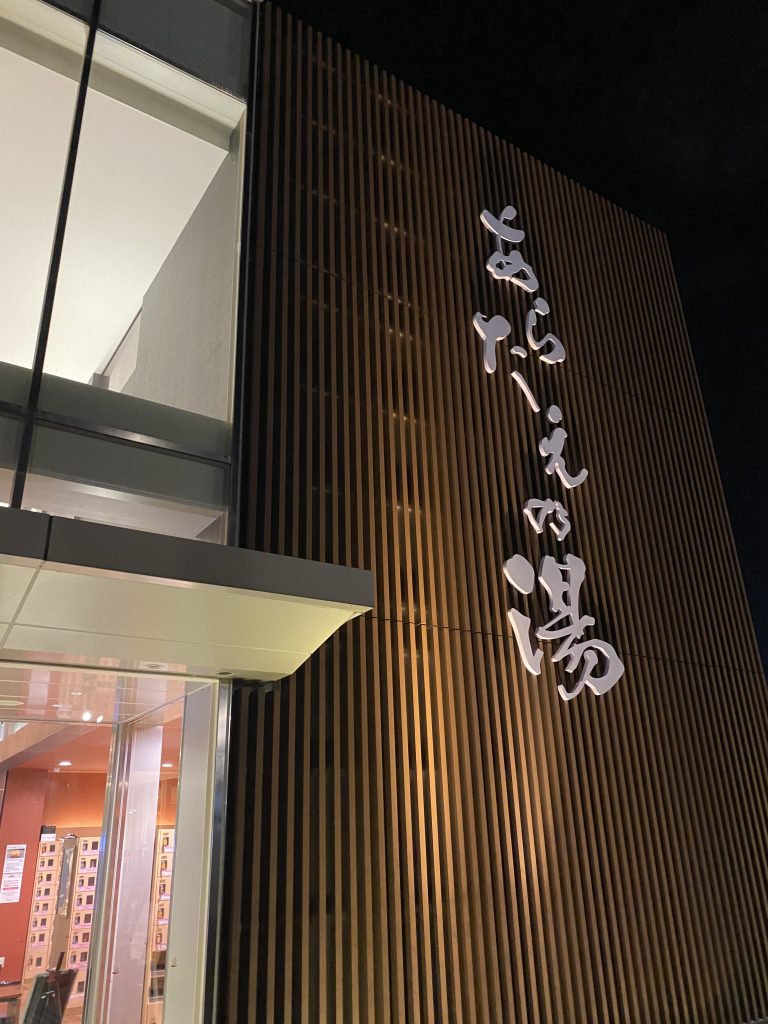 外もすっかり暗くなり、旅行の最終目的地であるスーパー銭湯「あらたえの湯」にようやく到着。